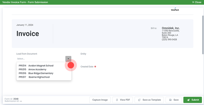 All open purchase orders will be available for selection. Select your PO and attach your invoice. Then adjust the line items if necessary, click Submit.